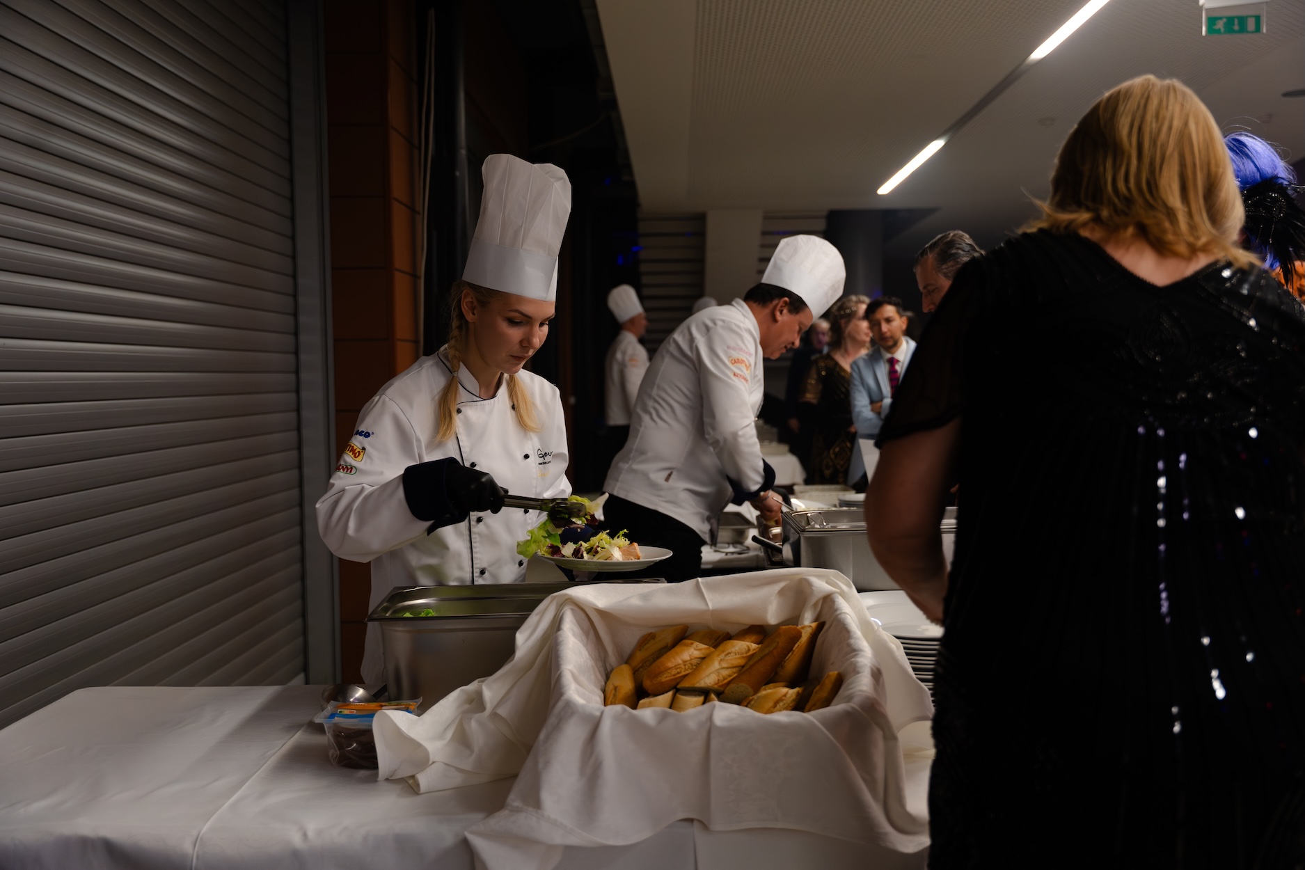 V ceně vstupenky je zahrnut raut (teplý, studený i menší popůlnoční). Večer zpříjemní také dobové drinky, pivo a klasika v podobě vína a prosecca. 🥂